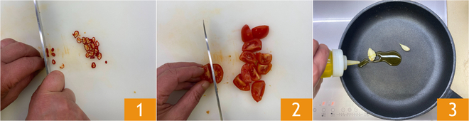 To prepare the Calabrian stroncatura with cherry tomatoes and anchovies, first slice the chili pepper 1 and quarter the cherry tomatoes 2. In a pan, pour a drizzle of olive oil and add 2 cloves of garlic in their skins, crushed 3.