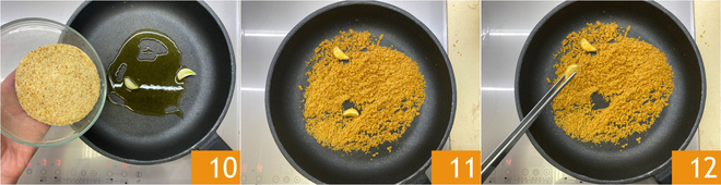 Meanwhile, in another pan, pour a drizzle of olive oil and add the other 2 cloves of garlic, still in their skins, crushed. Sauté for a few minutes, then add the breadcrumbs 10, cook until golden 11, then remove the garlic 12 and set aside.
