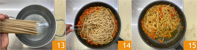 Cook the stroncatura in plenty of boiling salted water 13, drain it, transfer it to the pan with the sauce 14, and toss 15. If necessary, you can add some pasta cooking water.