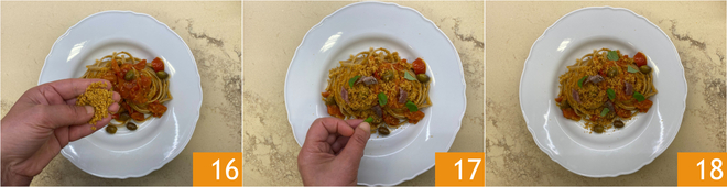 Plate it, add the breadcrumbs 16, finish with oil-packed anchovy fillets, cut into diamond shapes of about 0.8 inches and fresh basil 17. Your Calabrian stroncatura with cherry tomatoes and anchovies is ready to be served 18.