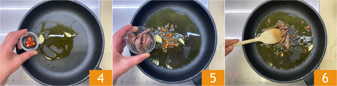 Add the chili pepper 4 and sauté for a few minutes. Add the anchovies 5 and let them melt over low heat 6.