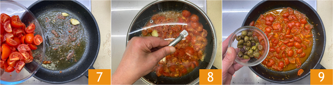 Add the cherry tomatoes 7, cover with a lid 8, and cook over medium heat for 10 minutes. Then add the Taggiasca olives 9, some fresh basil, and cook for another 10 minutes.