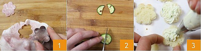 COOKED HAM CANAPÉS: To prepare the cooked ham canapés, use the flower-shaped cutter to cut 5 slices of sandwich bread 1 and 5 slices of cooked ham. Take 3 grilled zucchini rounds from earlier and cut them in half 2. Now compose the appetizers by putting a dollop of herb cream on each appetizer 3 (if you prefer, you can also use the shrimp cream),