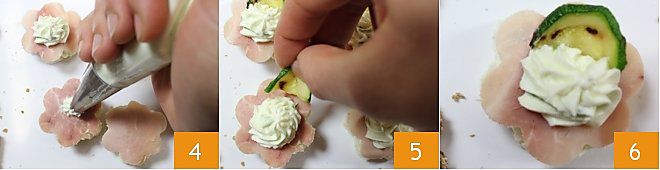 then a slice of ham, another dollop of cream 4 and finally decorate with a half slice of zucchini 5. The cooked ham canapés are ready! 6