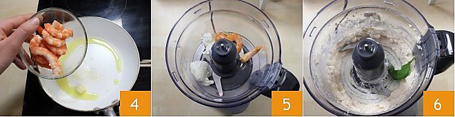 Cook the shrimp in the pan for a few minutes over high heat 4. Once cooked, blend the shrimp with a mixer along with 1.75 oz of Philadelphia cream cheese 5, a few basil leaves, salt, and pepper to taste, until a thick cream is obtained 6.