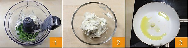 To prepare the herb cream, put 2 oz of Philadelphia cream cheese with chives 1 in a blender and blend until you get a thick cream 2, then adjust with salt and pepper if necessary. To prepare the shrimp cream, wash, clean, and shell the shrimp, and sauté a clove of garlic with a little oil in a non-stick pan 3.