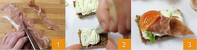 PROSCIUTTO CRUDO CANAPÉS: To prepare the prosciutto crudo canapés, cut the prosciutto crudo into strips and roll them on themselves to form small flowers 1, then cut two cherry tomatoes into quarters. Take the rye bread, remove the crust with a knife, and cut 5 small rectangles approximately 2 inches long (you can also use leftover bread scraps from the previous preparation to make the rectangles). Assemble the canapés by placing a dollop of herb cream on each bread slice 2. Complete with a prosciutto flower, a cherry tomato wedge, and a basil leaf 3.