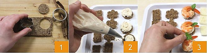ZUCCHINI AND SHRIMP CREAM CANAPÉS: To prepare the zucchini and shrimp cream canapés, cut in half the 10 grilled zucchini rounds you have left 1, garnish the rye bread discs with the shrimp cream 2 and decorate them with the zucchinis to form a flower and a basil leaf 3. Your zucchini and shrimp cream canapés are ready.