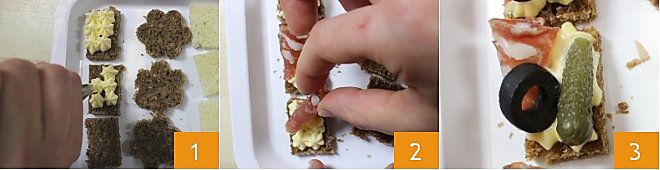 SALAMI CANAPÉS: To prepare the salami canapés, cut the salami slices into quarters, make 5 small rectangles of rye bread as in the previous preparation, using leftovers from previous preparations, slice an olive into thin rounds, and then transfer the mayonnaise into a pastry bag. Assemble the canapé by putting mayonnaise on each bread slice 1 and a quarter of a salami slice rolled up 2; finally, decorate with a small gherkin and an olive slice 3. Your salami canapés are ready!