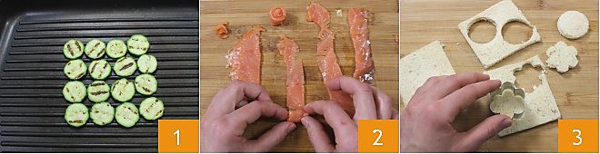 SALMON CANAPÉS: To make the salmon canapés, slice a zucchini into thin rounds and grill them for a few minutes (you should obtain 18 rounds) 1. Use a vegetable peeler to cut the zest off a lemon and julienne it finely. Cut strips of salmon 0.6 inches wide and 3 inches long, then roll them on themselves to form a small rose 2. Now, take the white sandwich bread, remove the crust, and using a 2-inch round cutter, get 5 shapes (we used a flower-shaped cutter, like the one for shortbread, and the circle, but you can choose any shape you like) 3.