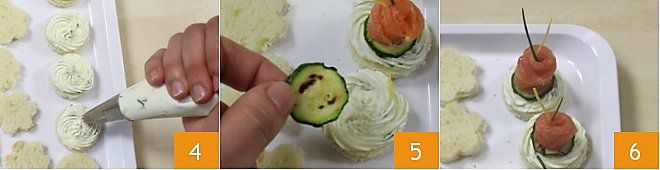 At this point, you can assemble your canapés: transfer the chive cream into a pastry bag fitted with a star nozzle and pipe a dollop on each bread slice 4, place a slice of grilled zucchini (you will use 5 in total, keep the remaining ones aside) 5, and finally the salmon rose. Decorate with a sprig of chives and the lemon zest 6. Your salmon canapés are ready!