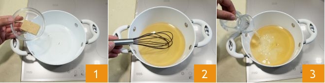 To prepare the canapés with jelly, place 250 ml of water in a large pot and bring to a boil. Take the gelatin mix 1 and dissolve it over low heat, stirring with a whisk 2, then add the remaining 250 ml of cold water 3 and