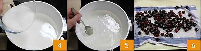Now that the jars are ready, prepare a syrup with sugar and water using 200 grams of sugar and a liter of water by proceeding as follows: place a pot with water on the heat and pour in the sugar 4. Bring to a boil, and stir until the sugar is completely dissolved 5. It is important not to overcook the syrup, otherwise caramel may form. Let the syrup cool, in the meantime, take the cherries, choose them firm and ripe, wash them well and dry them 6.