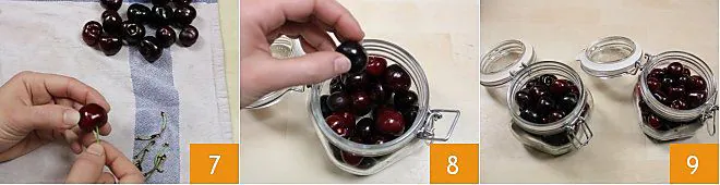 Remove the stem 7. Place the cherries in airtight jars 8, trying to arrange them to leave as few empty spaces as possible, but without crushing them too much. With the indicated quantities, you will obtain two jars with a capacity of 2 cups 9.