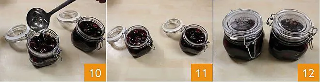 Pour the previously prepared syrup over the cherries inside the jars 10, shaking them occasionally to release any air bubbles; stop with the syrup 1 cm from the edge 11. Finally, close the jars 12. If you are using jars with screw caps, tighten the caps well but without over-tightening. At this point, proceed with boiling: place the jars in a large pot, to prevent the jars from breaking by bumping into each other while boiling, you can wrap them separately in some cloths. Fill the pot with water: the water level should not exceed the lid of the jars. Bring to a boil and boil for 20-30 minutes. After this time, turn off the heat, remove them from the water using tongs, and let them cool. If you are using jars with screw caps, once the jars have cooled, check if the vacuum has occurred correctly: you can press the center of the lid, and if you don't hear the classic "click-clack," the vacuum has occurred. If you are using jars with rubber gasket closures, at the time of consuming the cherries, you can do the vacuum test by pulling the appropriate tab: if when pulling it makes a snapping sound, it means that the content has been preserved with the correct vacuum. Conversely, if pulling the tab the gasket feels "soft," it means that the vacuum has not formed correctly, and it is better not to eat the content. Your cherries are ready to be enjoyed!