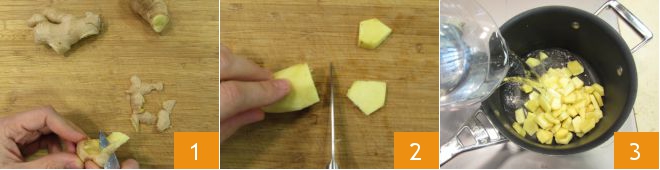 To make candied ginger, first peel the ginger 1, then cut it into pieces about 0.8 inches 2; you will obtain about 9 oz of ginger. Place the ginger in a saucepan, pour in enough water to cover it completely 3, and boil it for 30 minutes.