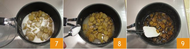 3.5 oz of water 7 and the salt 8. Stir and cook for 20 minutes over medium heat. After the cooking time, part of the water will have evaporated, and bubbles will have formed on the surface 9; turn off the heat and let the mixture cool.