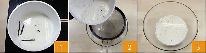 To prepare the cannelés, bring the milk to a boil with the opened vanilla bean 1; as soon as the milk is about to boil, remove it from the heat, strain it 2, and let it cool slightly 3.