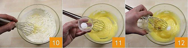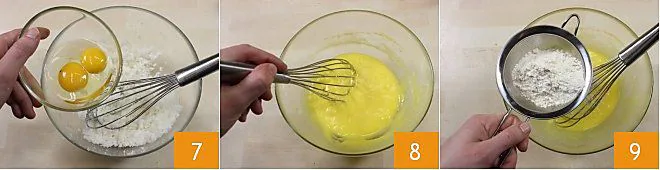 Now add the eggs and amalgamate them well into the mixture (7-8); add the sifted flour 9 and