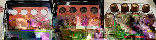 After the necessary time has passed, take a cannelés mold and brush it with plenty of butter; then put the mold in the refrigerator for about ten minutes to allow the butter to solidify. Pour the cannelés batter into the mold, leaving 2-3 millimeters of space from the edge 16. Put the mold back in the refrigerator for about 15 minutes and then transfer it directly to a preheated static oven at 392°F for 1 hour and 30 minutes (if using a fan-assisted oven, 356°F for 1 hour and 20 minutes). During baking, you will see the cannelés rise significantly and then slowly return into the mold. Remove the cannelés from the oven; they will be very brown on the outside: this is their characteristic, due to the caramelization of the sugar during baking 17. Let them cool slightly in the mold and when they are warm, unmold them 18 and serve immediately!