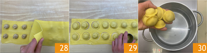 Cover with the second sheet 28. Try to remove the air around the filling and make sure the two sheets adhere well so the ravioli won't open during cooking. Use a pastry cutter to shape your ravioli 29. Cook them in salted boiling water for 3-4 minutes 30 until they float to the surface.