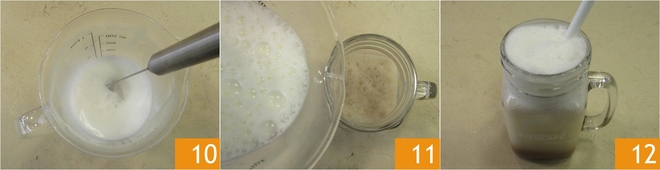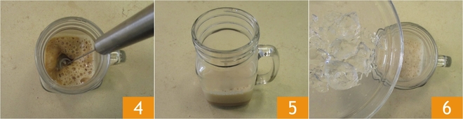 Lightly froth the liquid with a milk frother 4. Let it cool for a few minutes 5, then add some ice cubes 6.