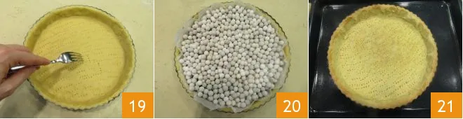 Prick the bottom of the tart with the tines of a fork 19, place a disc of parchment paper over the tart and pour in ceramic baking beads 20 (or dried beans), so that during baking the pastry doesn't puff up. Proceed with blind baking, baking your pastry in a preheated static oven at 355°F for 20 minutes (if using a convection oven, bake the crust at 320°F for about 15 minutes). Then remove the beads and continue baking for 5-6 minutes during which the pastry should turn golden but not overbake 21.