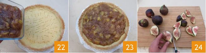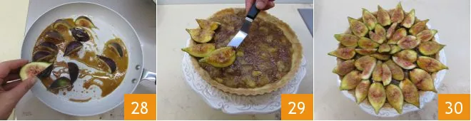 Let the pastry cool and only when the fig compote is also cool can you pour it over the base of your tart 22. Smooth the surface well 23 and start caramelizing the figs. Clean the figs needed for decoration by rinsing them very gently with cold water and, without peeling them, cutting them into 4 wedges 34.