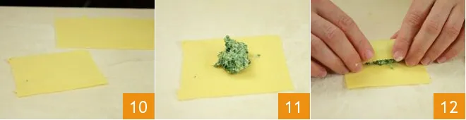 Roll out the egg pasta into a very thin sheet, which you will cut into rectangles measuring about 4x3 inches 10. In the center of each rectangle, place a scant teaspoon of filling 11 and roll the sheet over itself on the longer side 12.