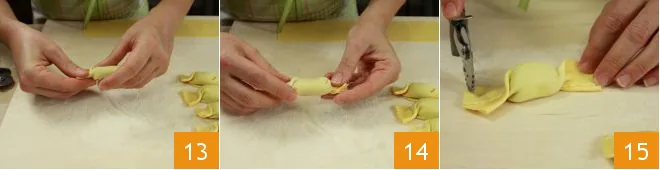 Now shape your candies: twist the right edge clockwise 13 and the left edge counterclockwise, as if to close the wrapper of a candy 14. Trim the outer edges of both flaps with a fluted wheel 15.