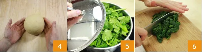Once ready, shape it into a sphere 4, wrap it in plastic wrap, and let it rest in a cool place with the light on for about 30 minutes. Focus on preparing the filling: boil the spinach in very little salted water 5 or steam them or simply sauté them over low heat in a non-stick pan. Then squeeze them and chop finely 6. Once cooked and well-squeezed, the spinach will weigh about 3.5 oz.