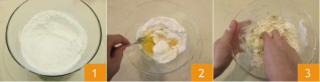 To prepare the ricotta and spinach candies, start with the Homemade pasta (sheets and shapes). In a bowl, pour the flour, holding back about 50 g to add as needed 1; then add the eggs 2 and mix everything inside the same bowl 3. When the eggs are absorbed, you can continue on a work surface and knead the dough until it is smooth and elastic.