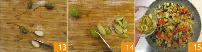 In the meantime, halve the larger caper berries 13 and coarsely chop the green olives, removing the pits 14. After 5 minutes, add the caper berries and olives 15, then stir and adjust the salt. Cook for another 5 minutes without the lid, then remove the vegetables from the heat and keep them warm 15.