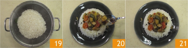 After this time, drain the rice 19 and plate, garnishing with a few spoonfuls of spicy vegetables 20. Finish with a drizzle of raw oil and serve your cardamom rice with eggplants 21!