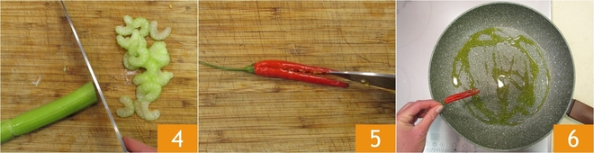 Do the same with the celery 4 and finally, slice the chili lengthwise 5. In a pan, flavor the oil with the chili for a couple of minutes over low heat 6.