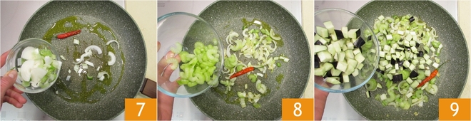 Add the spring onion 7 and sauté for a few minutes, then add the celery 8 and, shortly after, the eggplants 9.