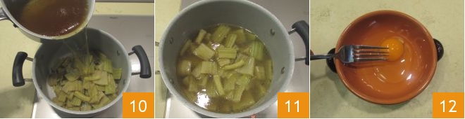 add the meat broth 10 and cook for another 5 minutes 11. Take 4 cocottes to serve the cardoon soup, and in each one, pour a whole egg, beat the eggs with a fork 12,