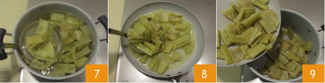 fill a bowl with water and squeeze lemon juice into it. As you cut the cardoon stalks, immerse the pieces in the acidulated water to prevent them from turning brown 4. Now, in a pot, bring salted water to a boil, immerse the cardoons drained from the soaking water 5 and blanch them for a couple of minutes, leaving them al dente. In a pan, melt the butter with the olive oil 6;