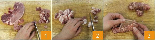 To prepare the Carnival lasagna, start by making the ragù: take both the pork chop and shoulder and cut them into small pieces 1, then dice the bacon 2, peel the sausage 3 and crumble it, and set the meat aside.