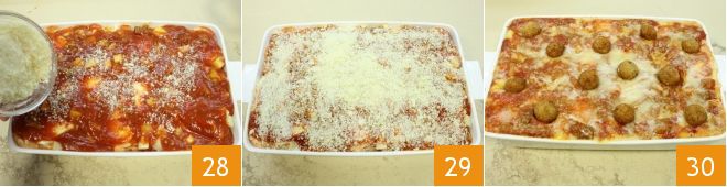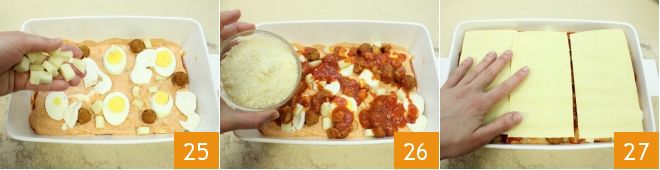 Add the mozzarella, smoked cheese 25, meat ragù, and sprinkle with grated cheese 26. Continue with another layer of lasagna sheets 27.