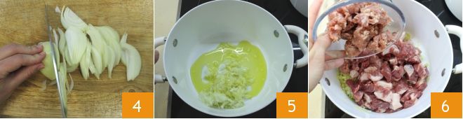 Now peel the onion and slice it thinly 4, let it soften in a large pan with some extra virgin olive oil for a few minutes 5. Then add the crumbled sausage and chopped meats 6, and brown them well.
