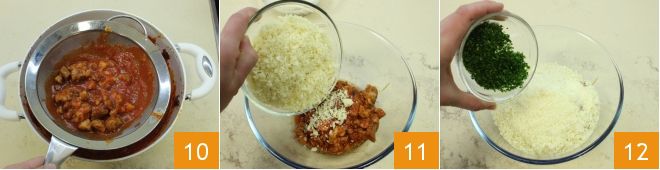With a slotted spoon, remove 14 oz of meat, draining it well from the tomato sauce 10; place it in a bowl and add crumbled bread crumbs 11, chopped parsley 12, salt, and pepper.