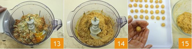 Transfer the mixture to a food processor, add the eggs 13, and blend until smooth 14. With the obtained mixture, make small meatballs no larger than a cherry 15.