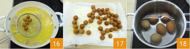Fry them in olive oil 16 and let them drain of excess oil on a plate lined with paper towels 17. Meanwhile, hard-boil 6 eggs 18.