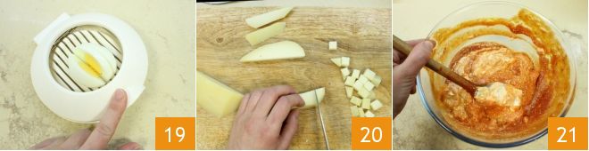 Once cooled, slice them thinly with a knife or egg slicer 19. Slice the smoked cheese 20 and mozzarella as well. In a bowl, mix the ricotta until creamy and thin it with a bit of tomato sauce 21.