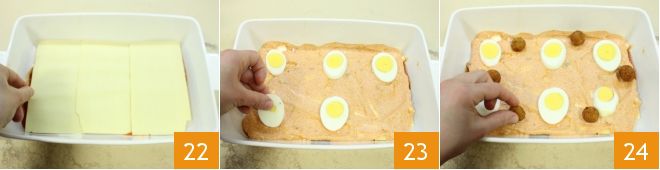 Take a 12x8 inch baking dish and spread a little extra virgin olive oil and some sauce on the bottom. Lay down the first layer of lasagna 22 and cover it with the ricotta cream 23, place the thinly sliced hard-boiled eggs and distribute the fried meatballs 34.