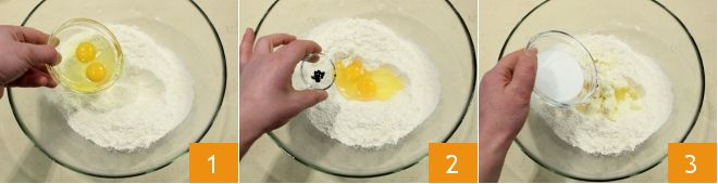 To prepare the Carnival masks, start with the dough: sift the flour into a bowl and add the eggs 1, then add the seeds from a vanilla pod (you can extract them by cutting the pod lengthwise) 2; also add the chopped butter, a pinch of salt, and the sugar 3.