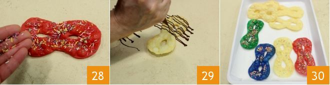 and decorate them with colored sprinkles 28. You can also brush the white ones with honey, or decorate with melted dark chocolate using a water bath and poured into a piping bag 29, or simply dust with powdered sugar. Your Carnival masks are ready to be devoured 30.