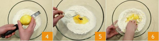Grate the zest of one lemon 4 and finally add the wine 5. Start mixing the ingredients in the bowl 6.