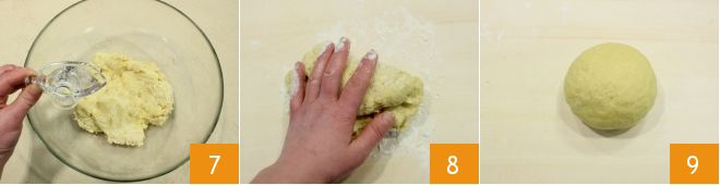 When the dough becomes more homogeneous, add the water little by little 7, then knead and transfer the dough to a lightly floured surface to work it 8. Form a ball 9.